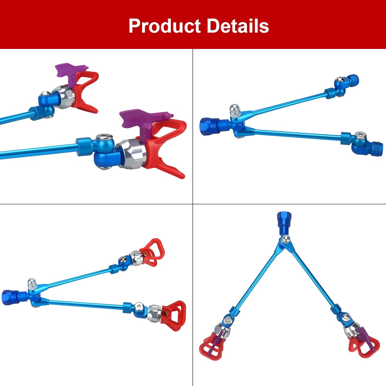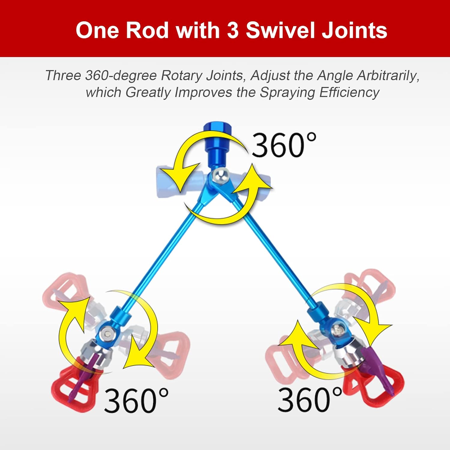 La prolunga per pistola a spruzzo airless ha tre giunti rotanti a 360°, è possibile regolare l'angolazione a piacimento, migliorando notevolmente l'efficienza di spruzzatura.