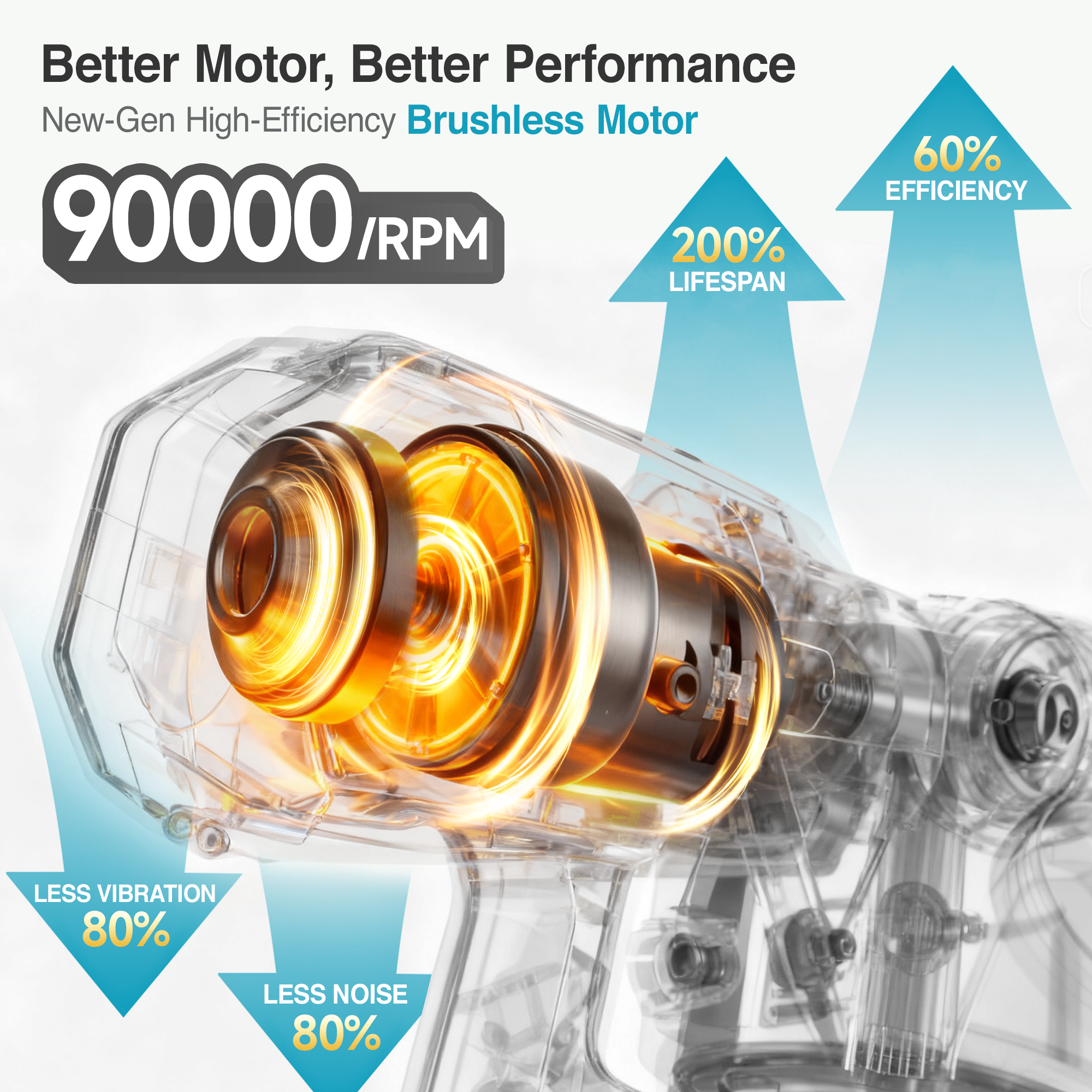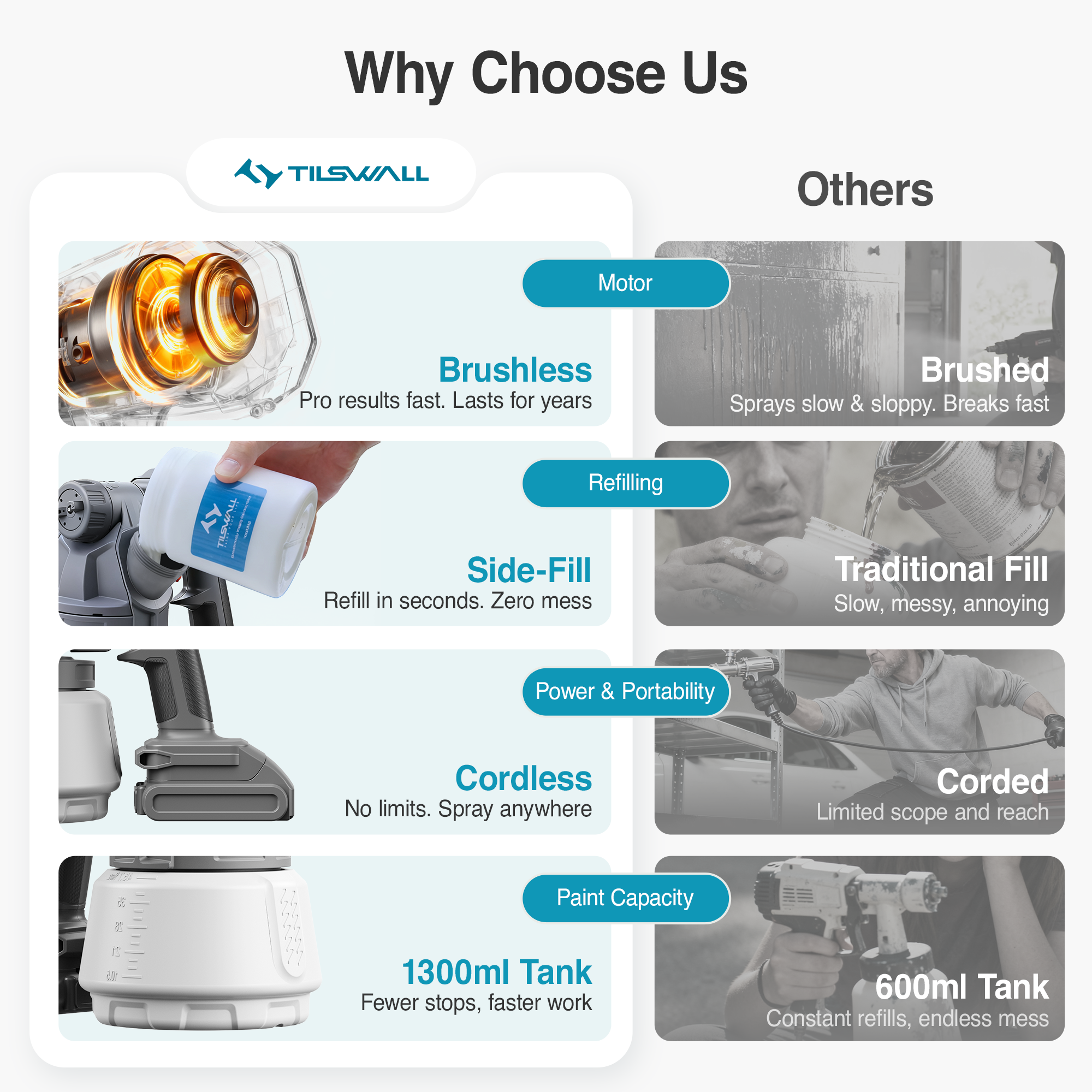 Scopri un nuovo livello di verniciatura con Tilswall Shark 700, il verniciatore a spruzzo a batteria progettato per chi vuole risultati da professionista. Il motore brushless da 90.000 giri/min assicura un’atomizzazione fine e uniforme, riducendo rumore e vibrazioni. Perfetto come spruzzatore vernice per muri, soffitti, mobili o recinzioni — ogni dettaglio, dal design bilanciato alla potenza controllata, riflette eleganza e prestazioni superiori