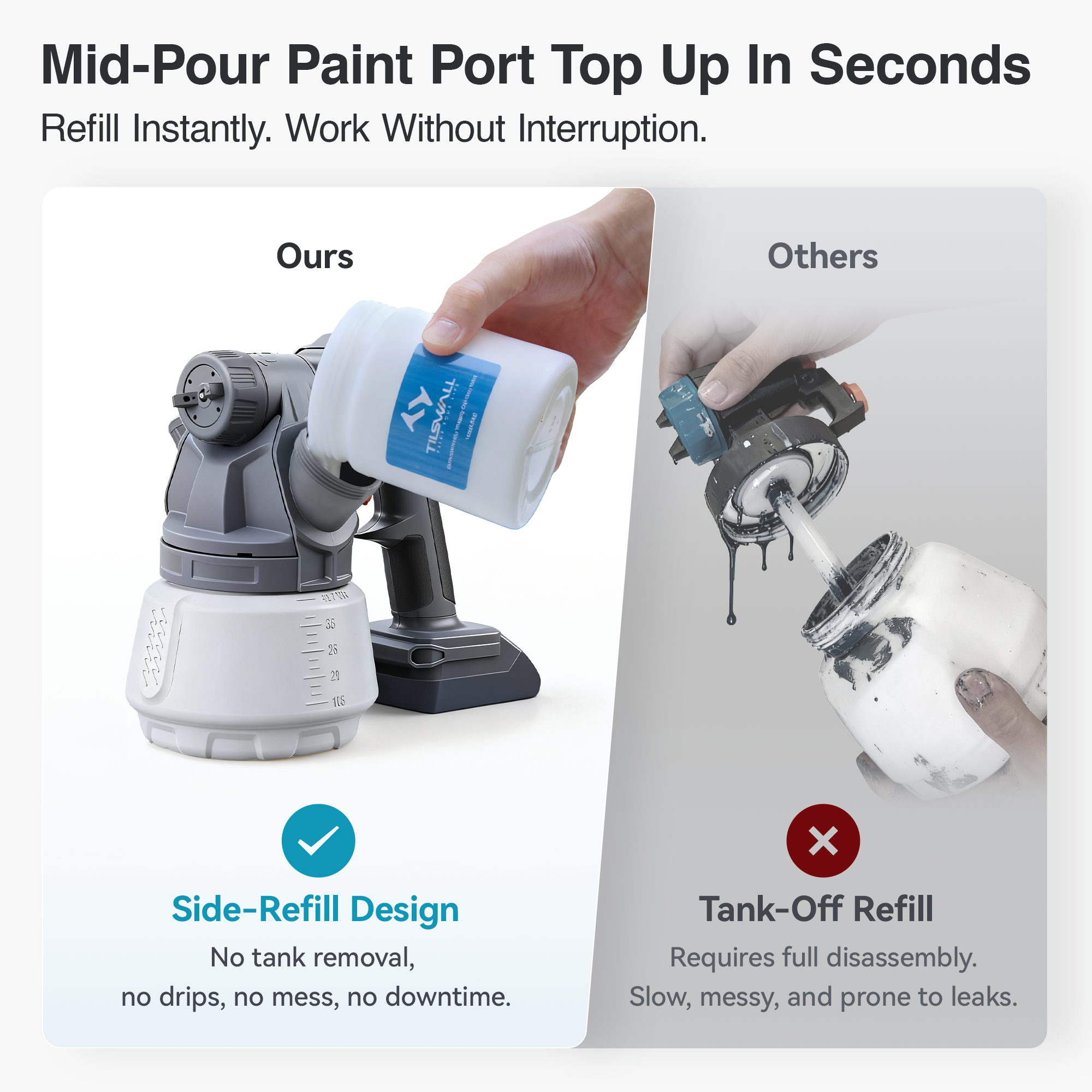 Il sistema Side-Fill rende la ricarica della pistola per verniciare muri semplice e pulita. Versa la vernice dal lato, senza gocciolamenti o interruzioni, e approfitta del serbatoio extra-large da 1300 ml per lavori su muri, soffitti, mobili da giardino o cancelli. Questo verniciatore a spruzzo trasforma la pittura in un’esperienza fluida, precisa e senza stress