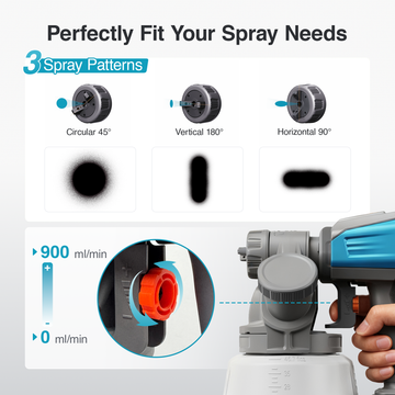 Con i tre modelli di spruzzo (orizzontale, verticale e circolare) e gli ugelli in ottone di precisione da 1,5 mm e 2,5 mm, il verniciatore a spruzzo per muri Tilswall Shark 700 garantisce una distribuzione uniforme del colore. Regola il flusso fino a 900 ml/min per coperture ampie o lavori di precisione — ideale come spruzzatore vernice per muri, mobili, cancelli e capanni