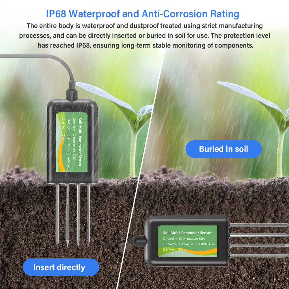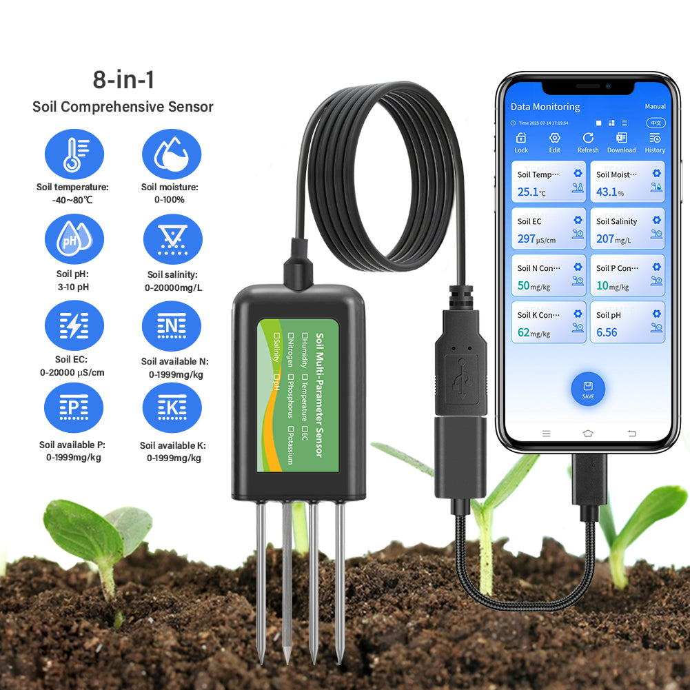 Monitora temperatura del terreno, umidità, pH, EC, salinità e livelli di NPK (azoto, fosforo, potassio) con un unico dispositivo.